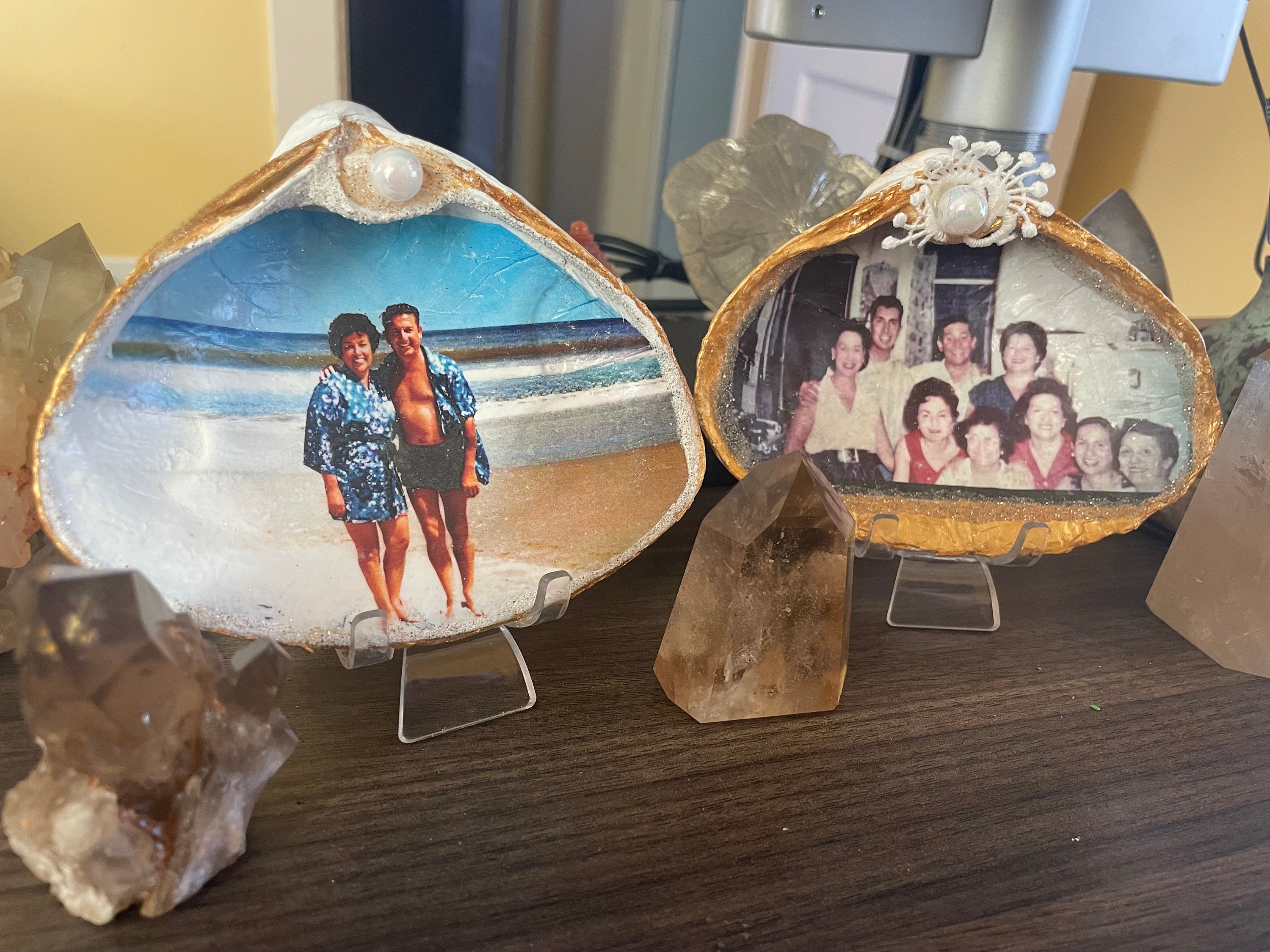 My Shell Tales are beautiful! They feel like a family reunion on my desk. The picture inside the curvature of the shell draws you in; it's like looking at a sweet memory through the mind's eye. The effect is much more personal than a flat picture in a frame. The artisan worked with me to select finishes and she made sure that the vintage photos were are sharp as possible. The shells were packed carefully, protected in plastic boxes and bubble wrap, and the package arrive quickly. Most highly recommended for a unique, beautiful, precious picture moment!