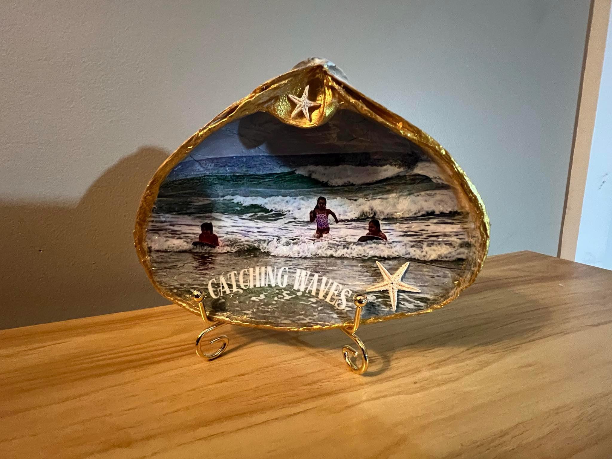 Transfer a treasured photo into a shell to give it a more permanent place than a frame! Make a series of family portraits for your living room or commemorate a beloved pet. Or why not give one as a gift to a friend? They’ll be touched by your thoughtful keepsake. Vacation Shells, Birthday Shells for Her, Valentine's Day Shell. Preserve a memory in the stillness of time by transferring it onto a photo-encased shell. Capture your favorite pet pose or perhaps a celebration of any kind and display it for all to see. Shells are sterilized, painted, and sorted by size. Your photo is enhanced and edited for the best presentation. A laser printer is used to print your photo, and a special photo-transfer medium is precisely applied to the shell and your photo. After the photo is delicately placed into the shell, it will dry for 1 to 2 days before the paper is removed. Your photo is now embedded into the shell. This is NOT decoupage. Your photo is then decorated and enhanced to your liking and embellished with sparkling Cape May sand. Your carefully packaged shell will arrive in 1 to 2 weeks.