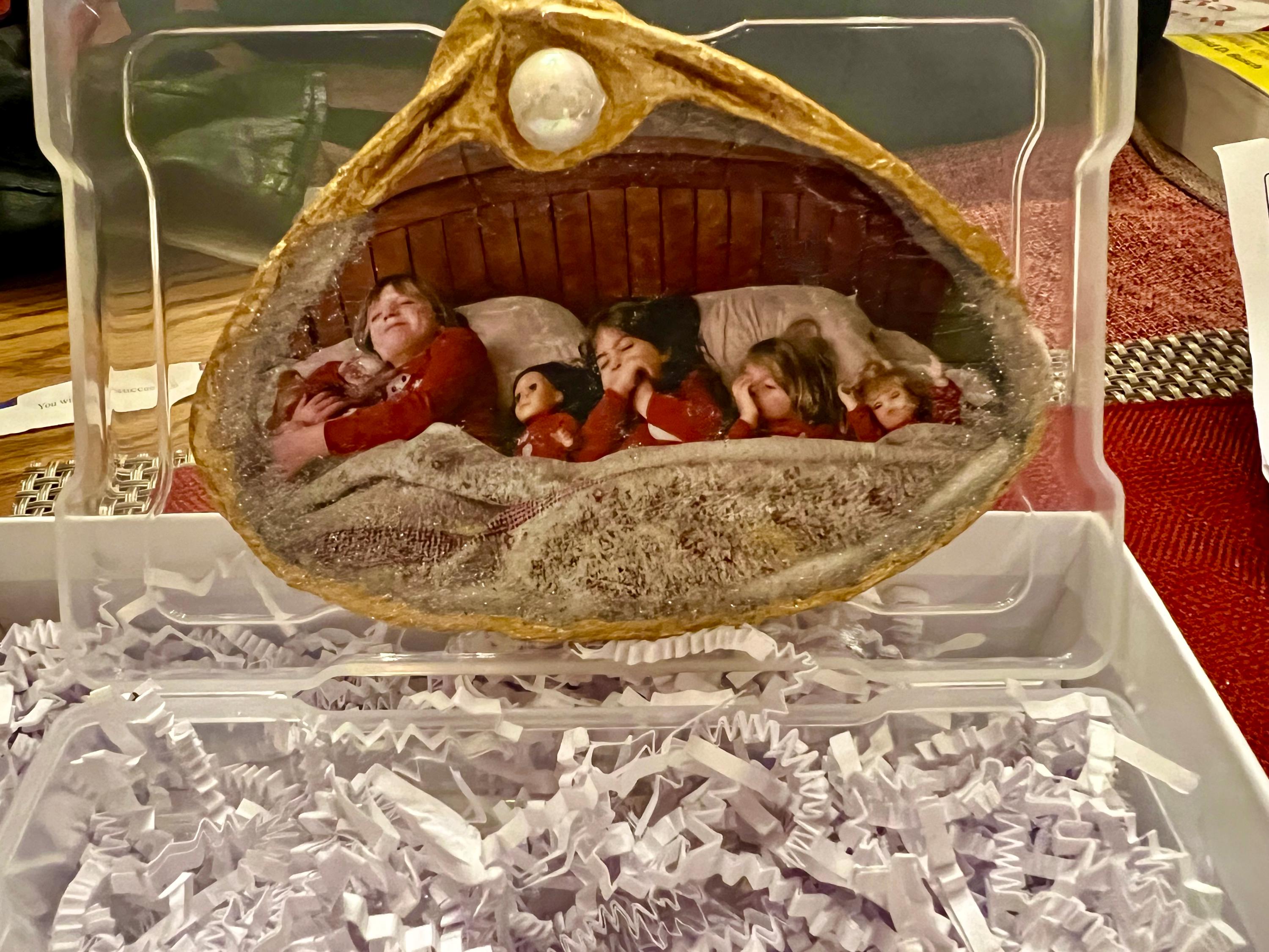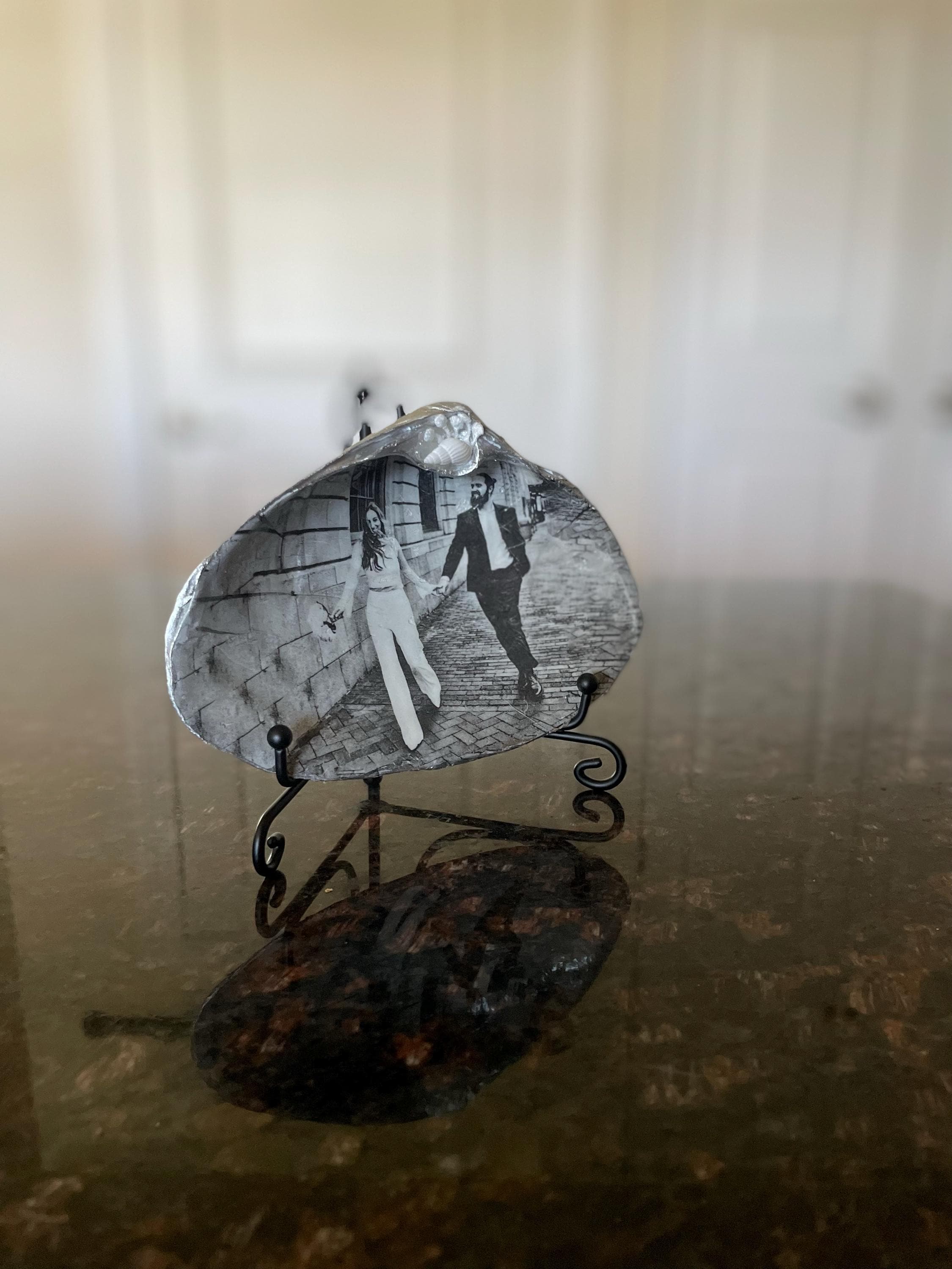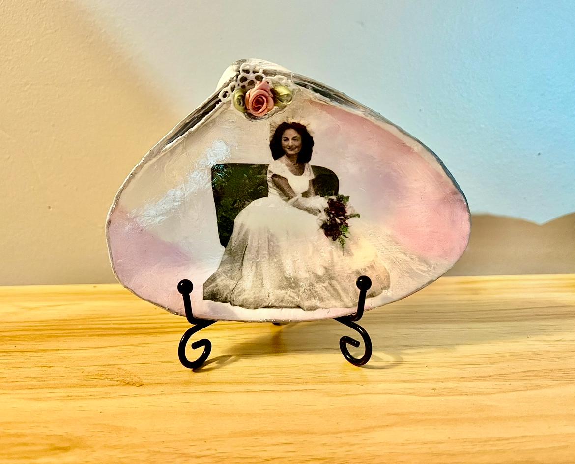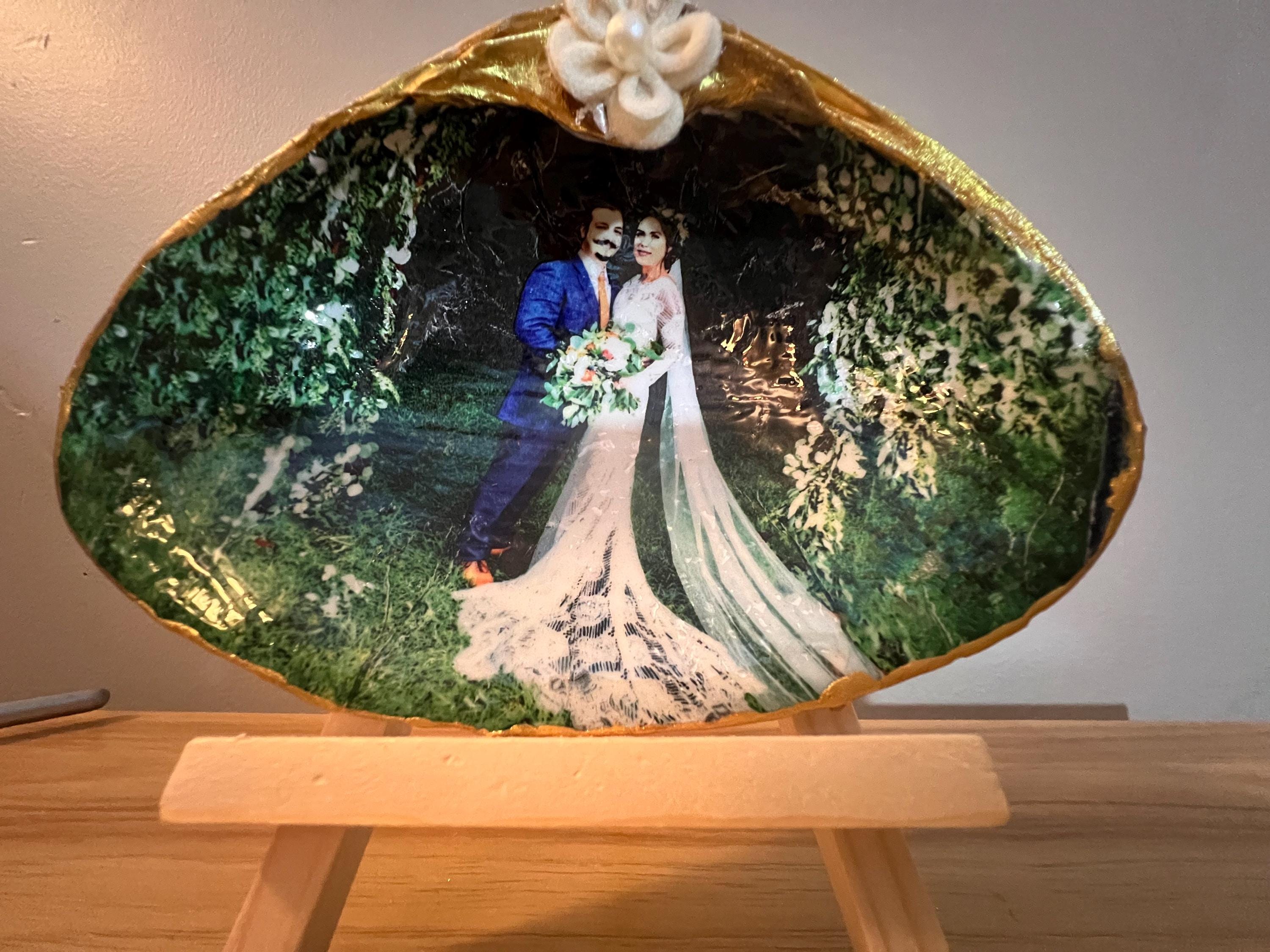 Wedding Photos that are transferred into a shell- a unique and personal gift for newlyweds or anniversary gifts from the shore to keepsake.