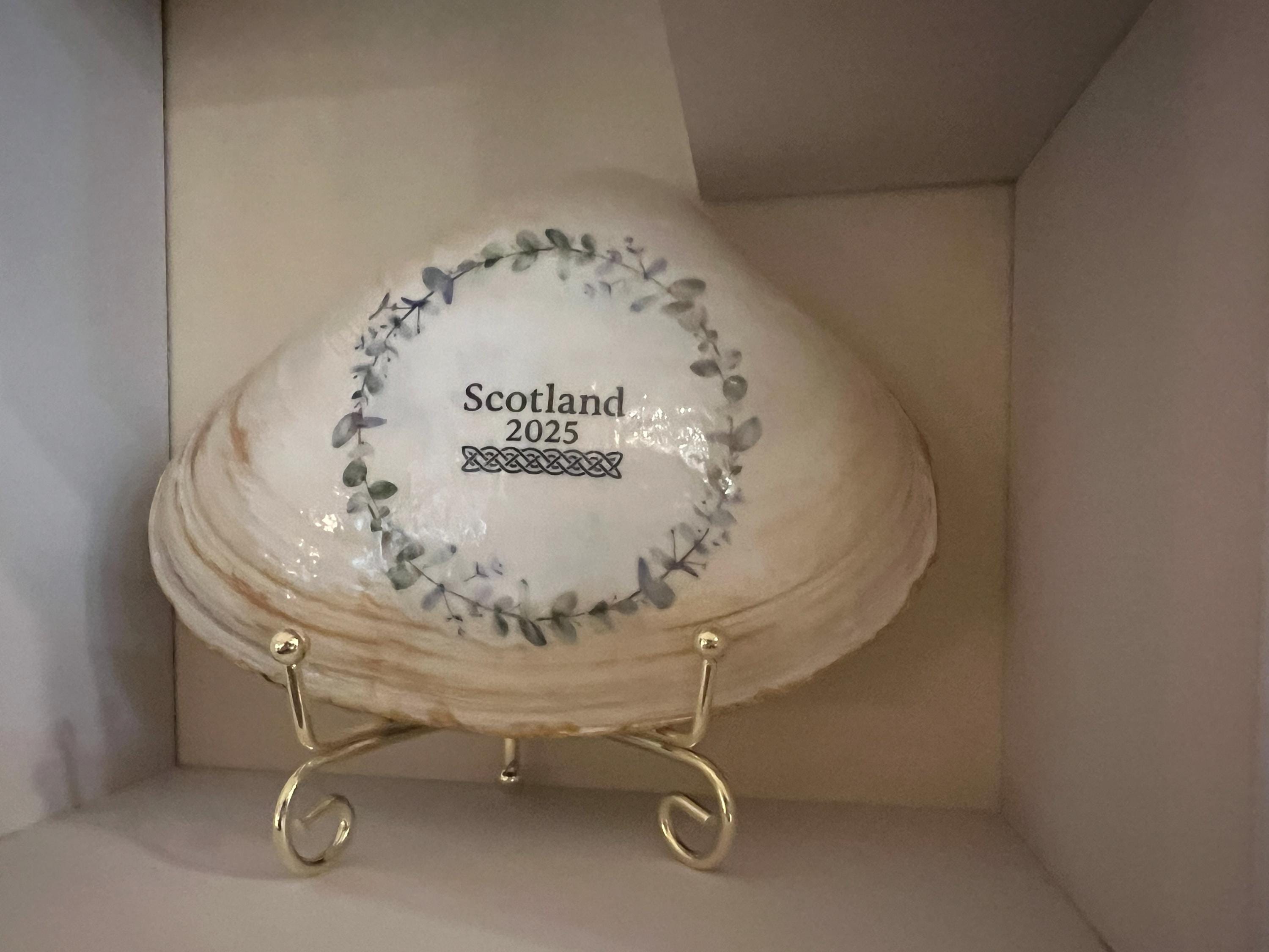 ✨ Each shell is sealed, embellished with optional gold or silver trim, and displayed on a clear stand.