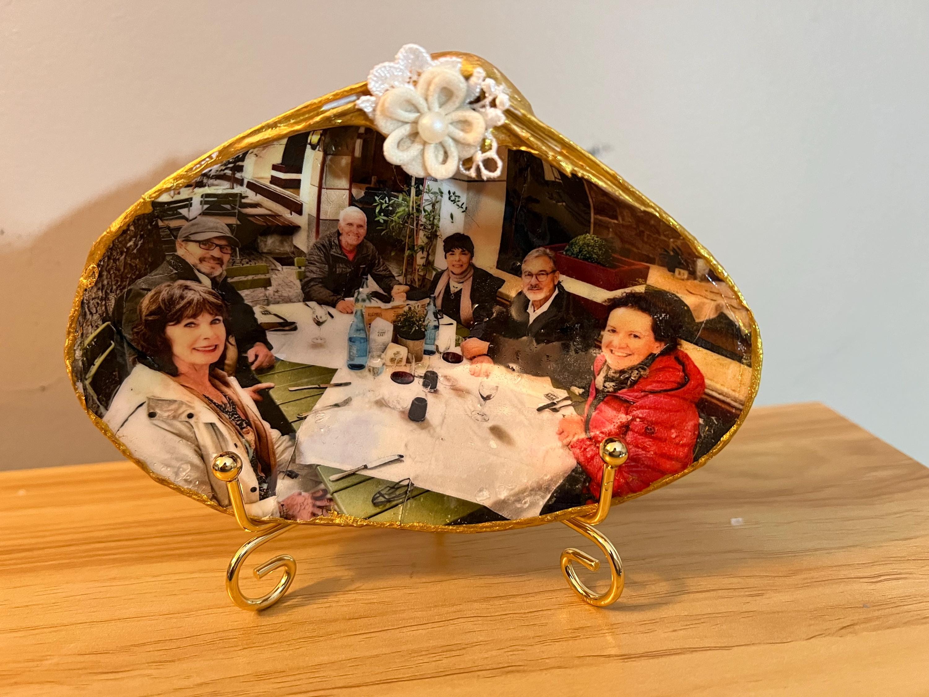 Happy moments captured on a shell. Your personal photo transferred into a shell, sealed with resin and displayed with a stand.