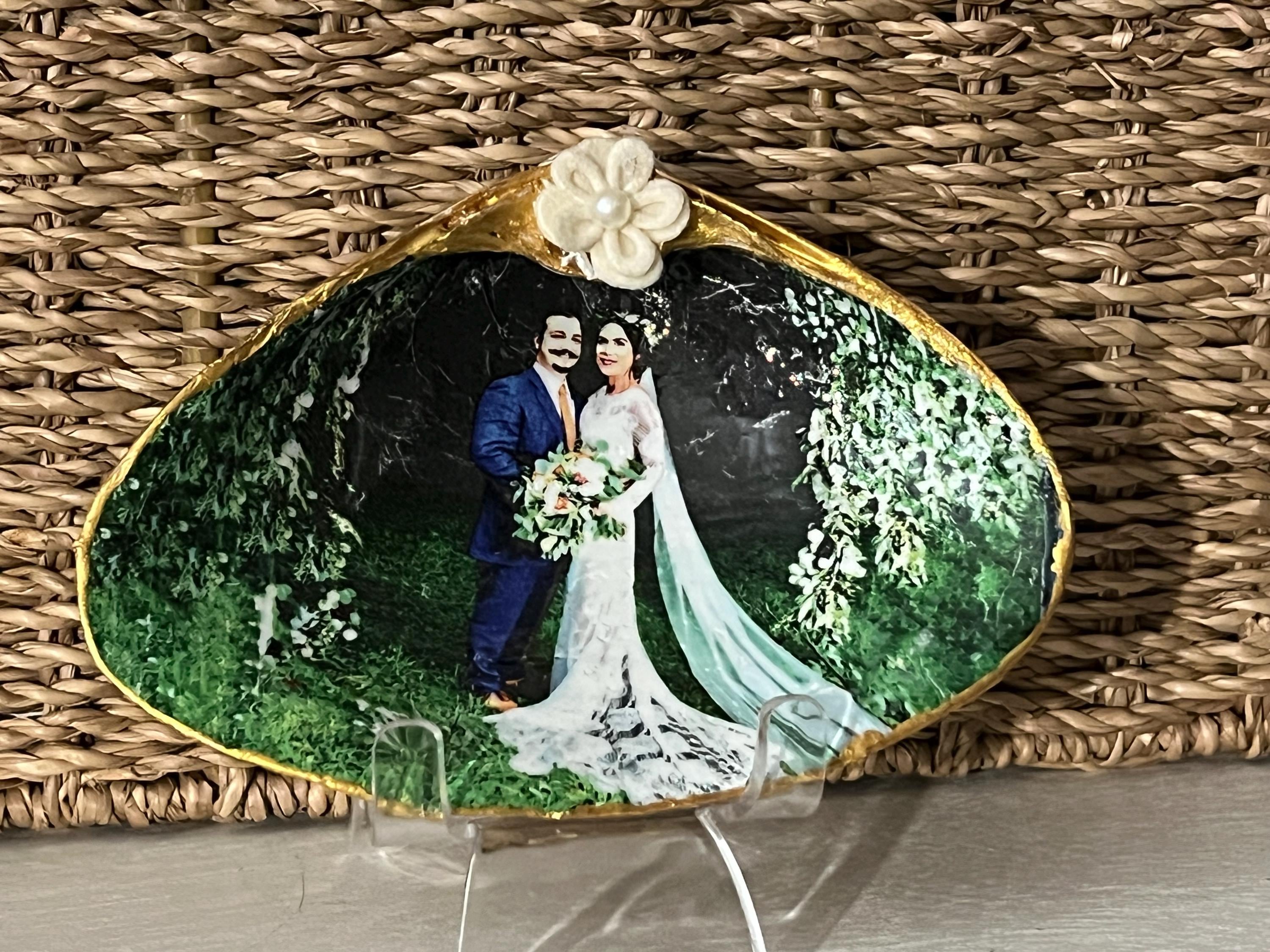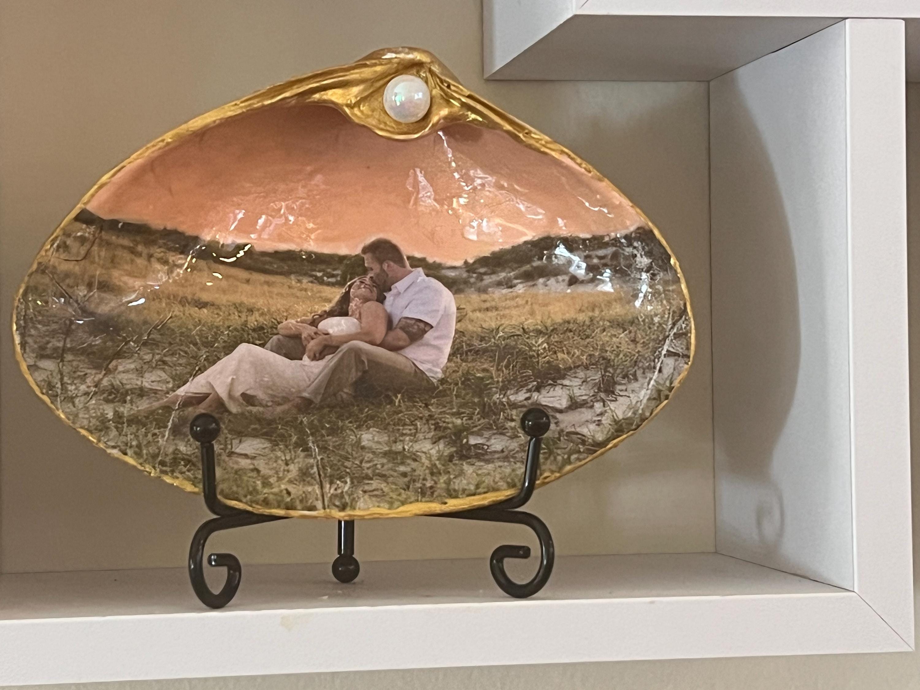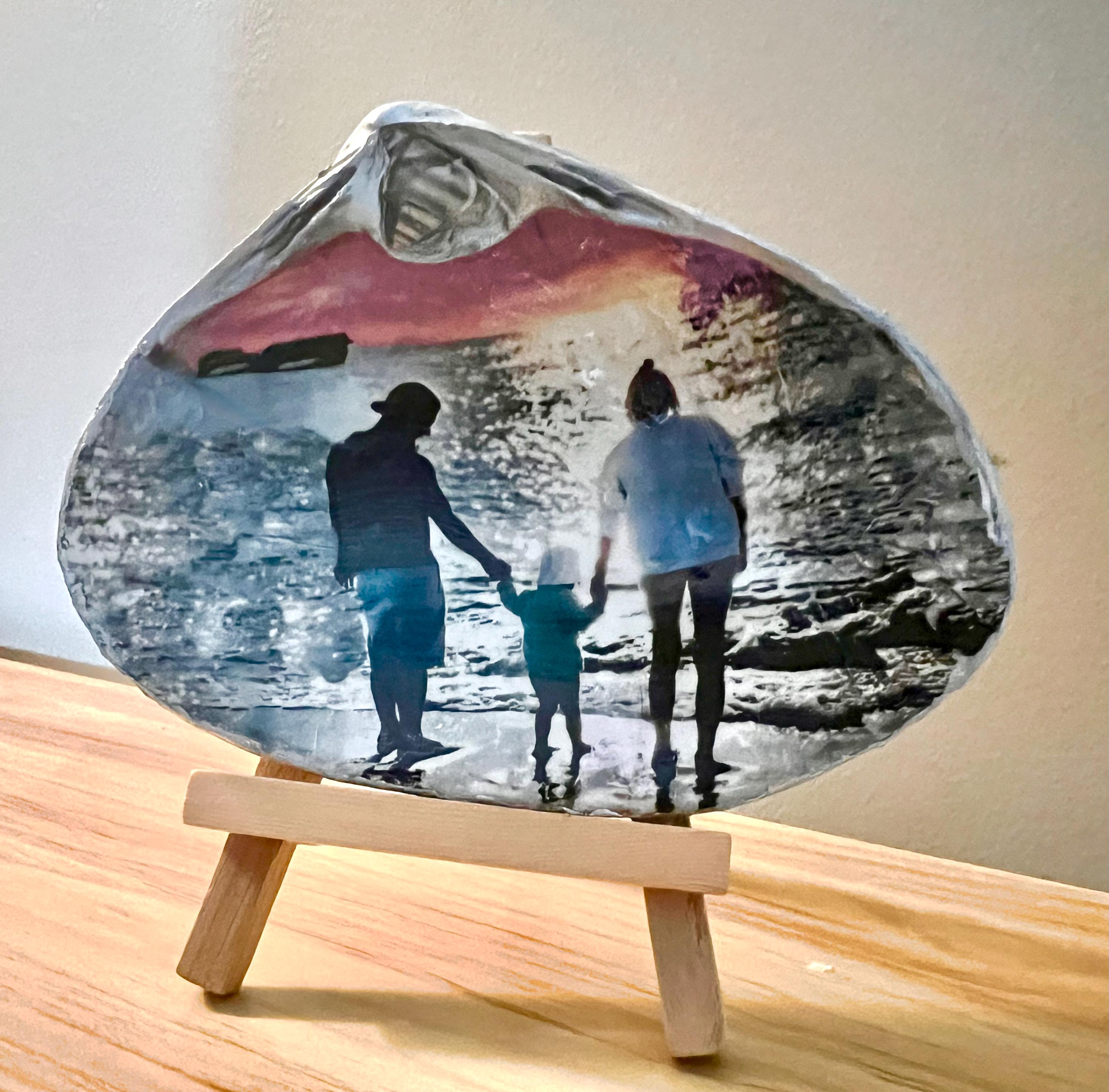 Each Shell Tale is handcrafted from Cape May shells — your image is transferred by hand (not decoupaged) and sealed in glossy resin for a luminous, lasting finish.