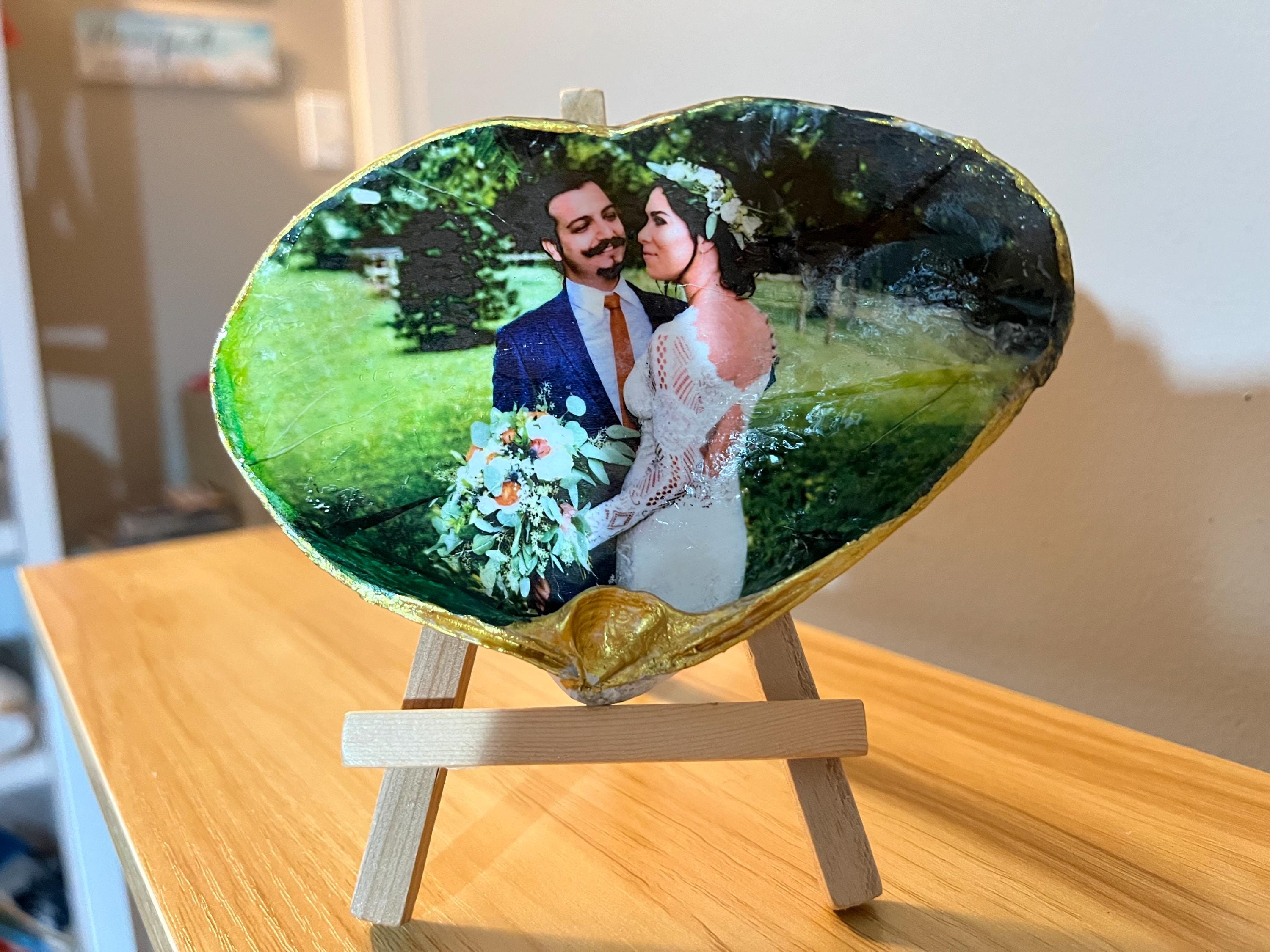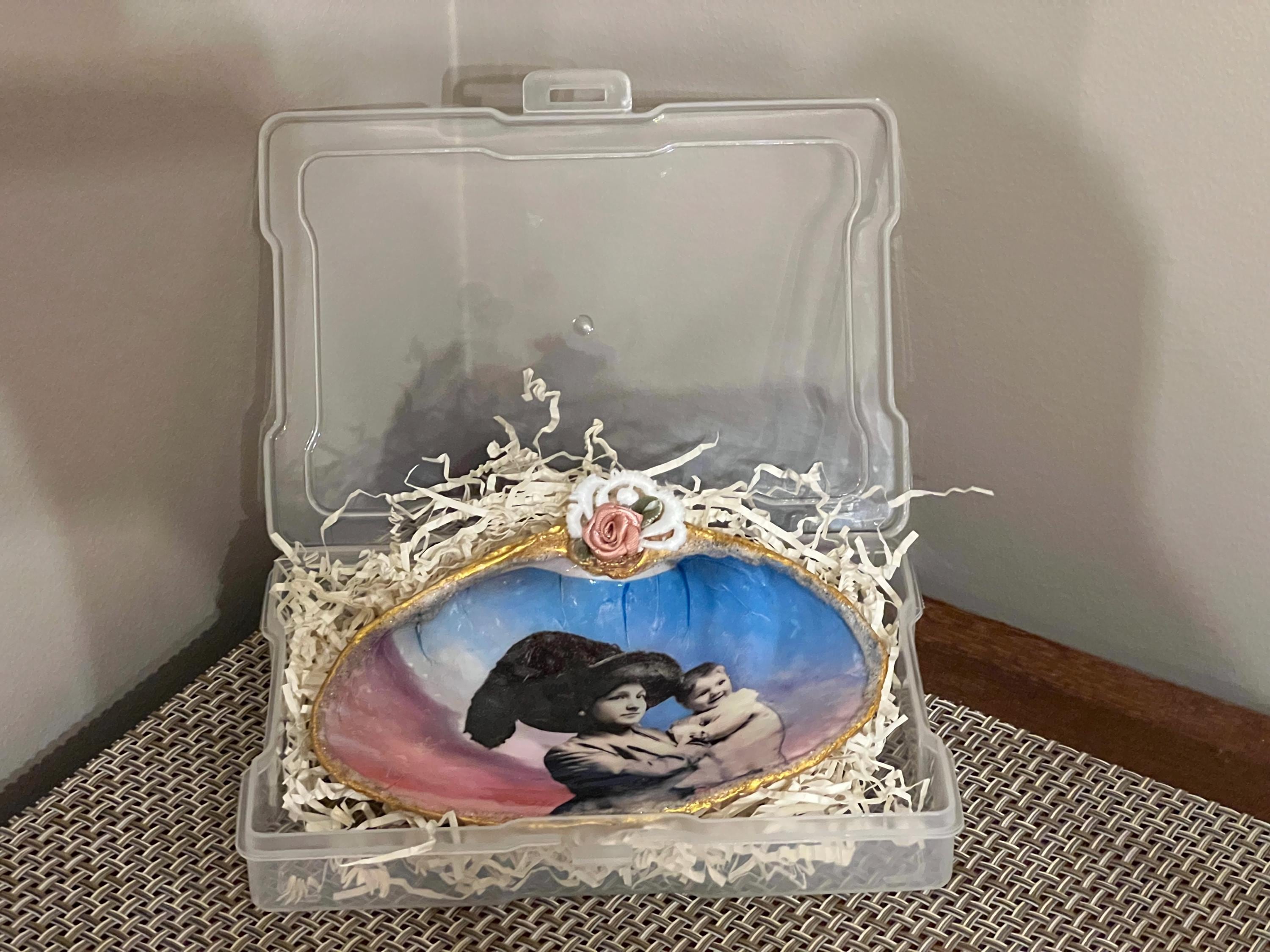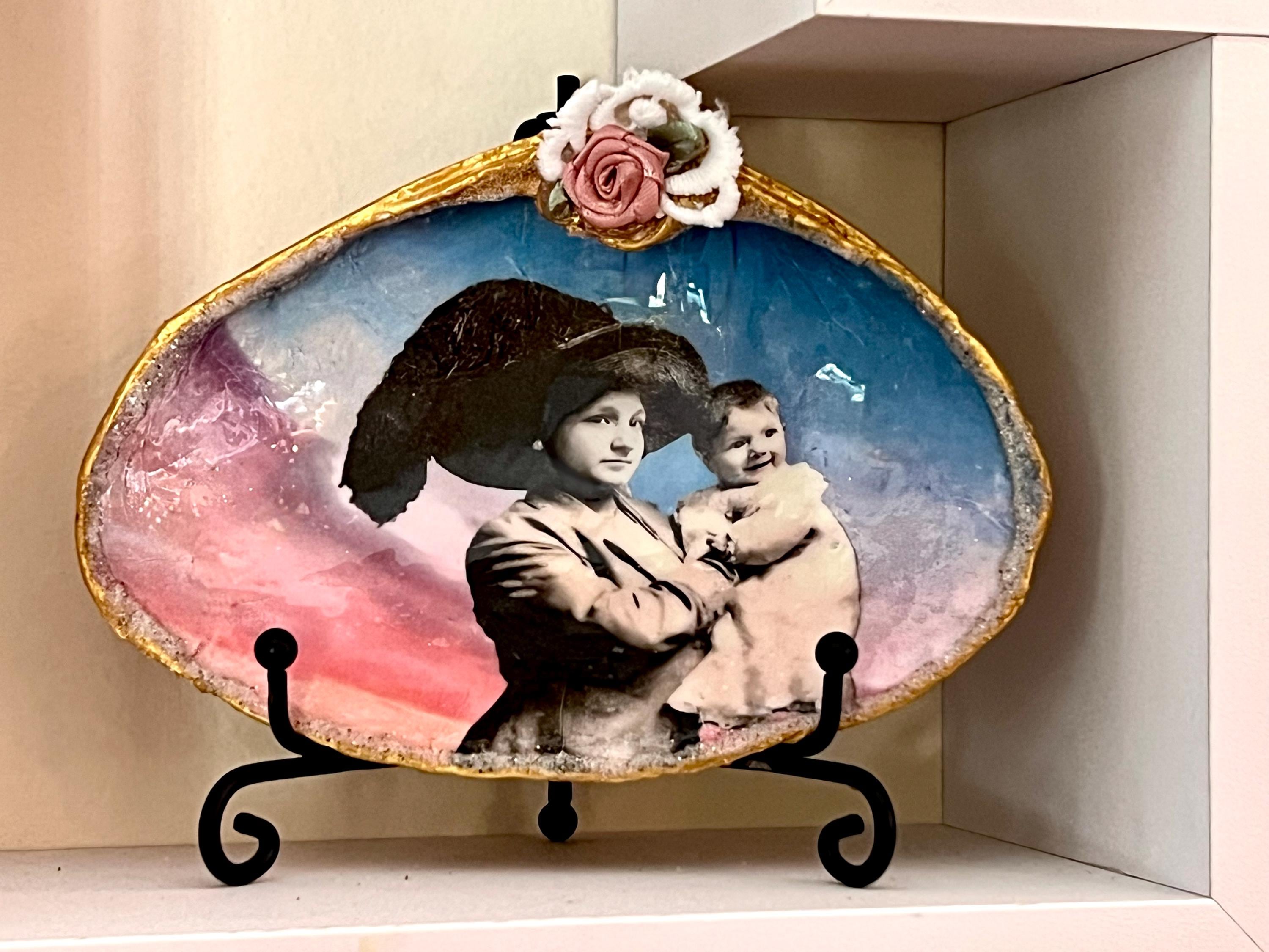 Each Shell Tale is handcrafted from Cape May shells — your image is transferred by hand (not decoupaged) and sealed in glossy resin for a luminous, lasting finish.
