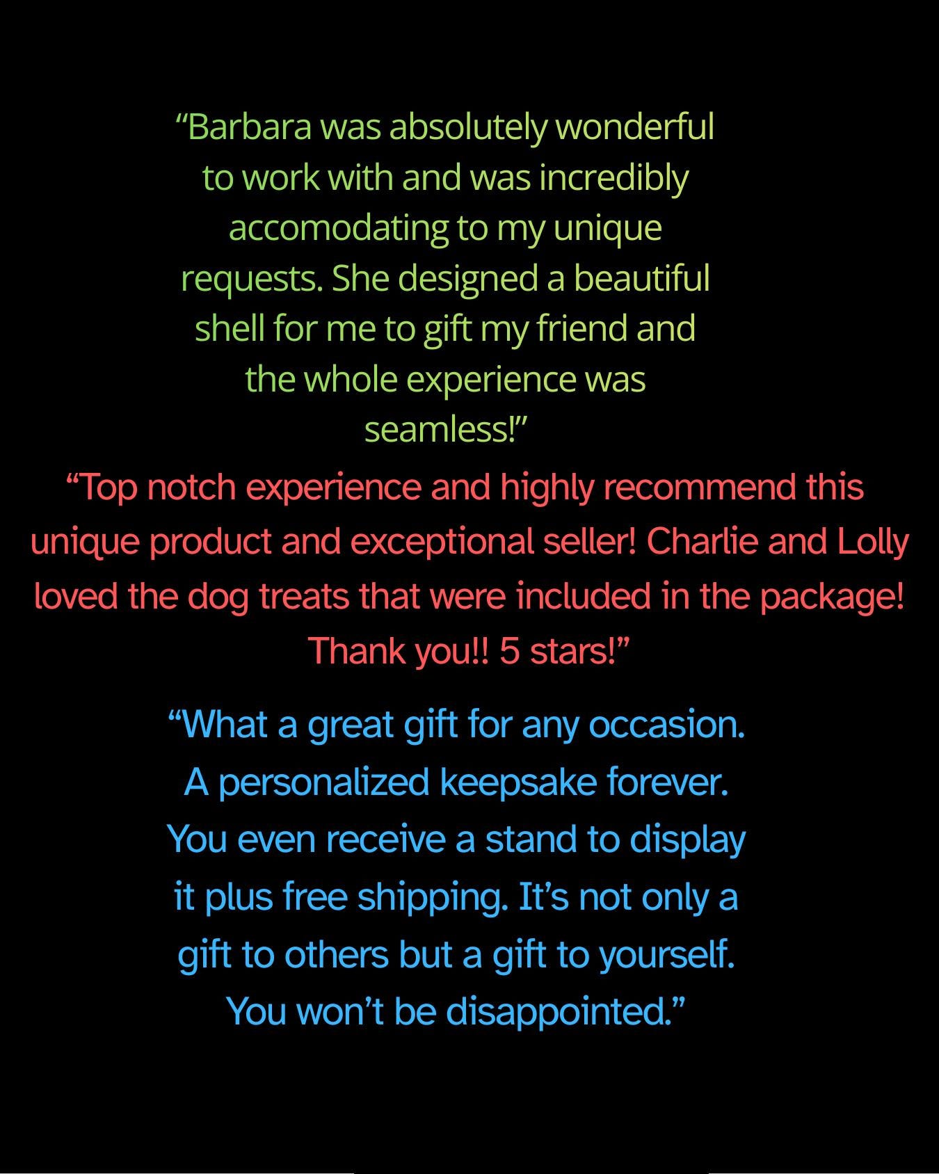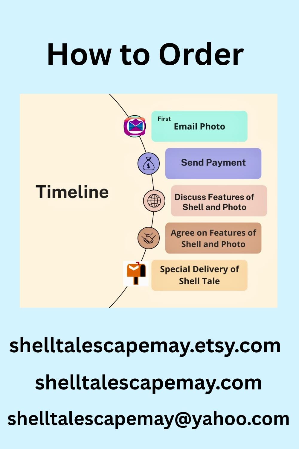 After receiving your photo by email a confirmation will be sent out. It takes 24-48 hours for your photo to transfer to the shell and another day to seal and decorate. Shells will then be mailed out. Shipping is free.