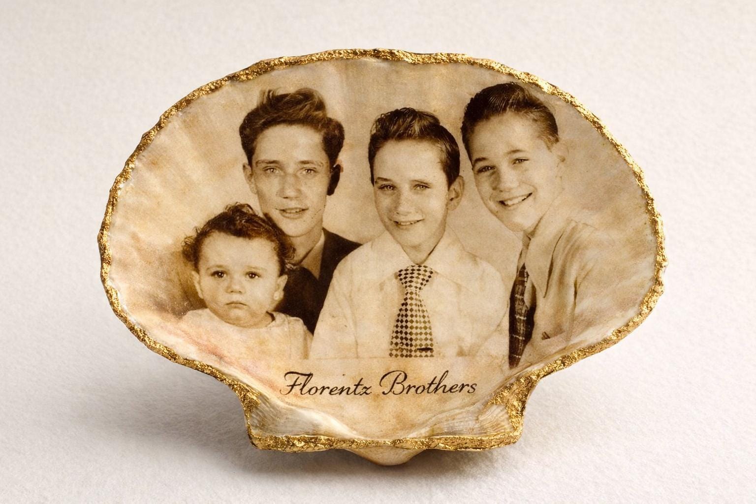 From cherished childhood portraits to family milestones, your memories are thoughtfully brought back to life—then permanently embedded into a natural shell for a truly unique keepsake. This one-of-a-kind Shell Tale preserves a treasured vintage photograph of the Florentz brothers—carefully restored and hand-transferred into a real Cape May clam shell.